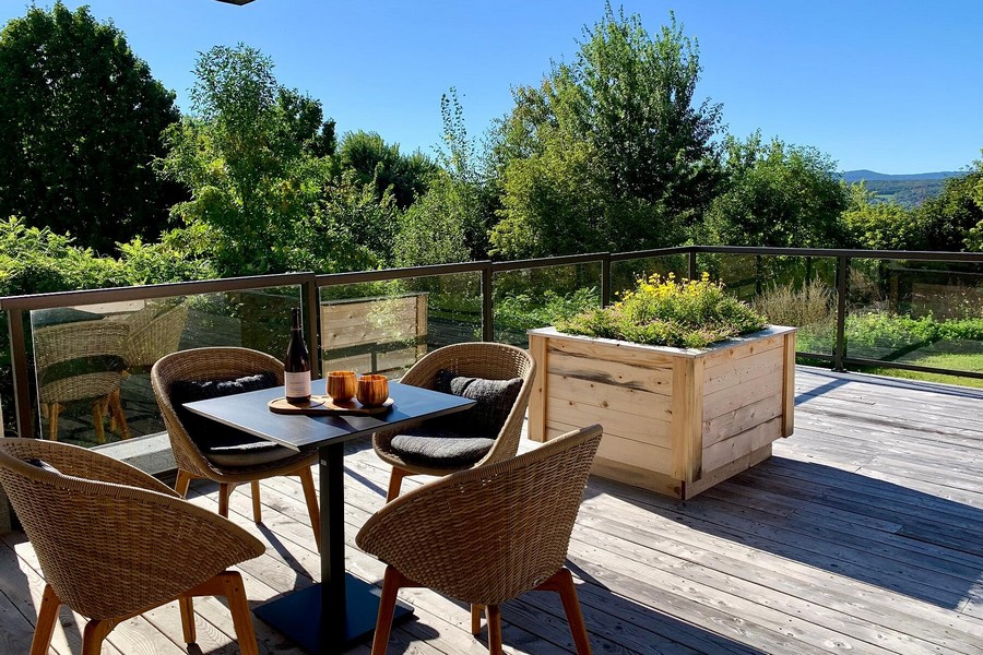 Une immense terrasse avec vue sur la nature et le fleuve (en période hivernale) permet d’apprécier tous les charmes de la vie à la campagne.