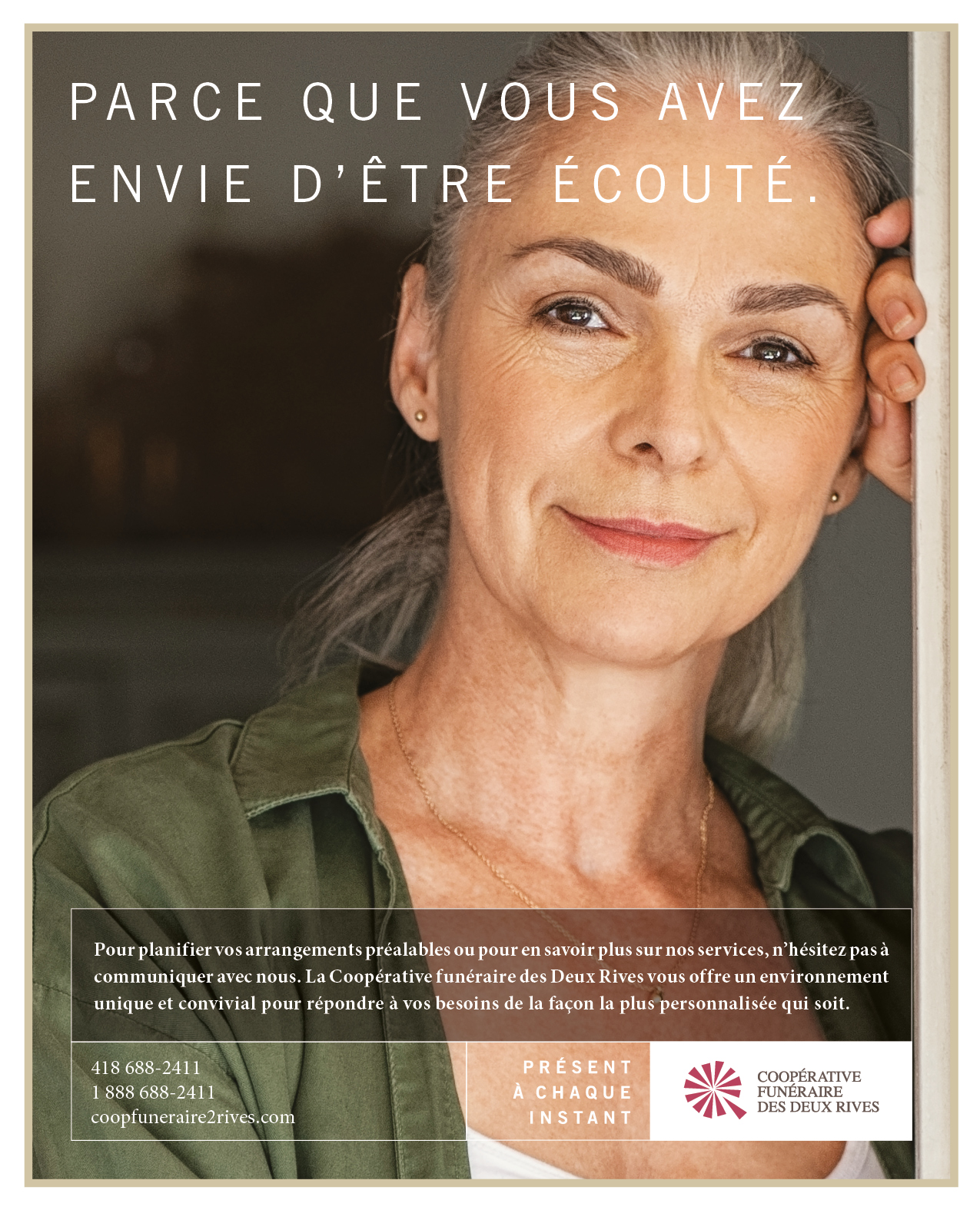 « Le moteur, la finalité d’une coopérative, c’est d’exister par et pour la communauté. La Coopérative funéraire des Deux Rives n’y fait pas exception. Elle se distingue par son approche résolument humaine et professionnelle qui se vit au rythme des valeurs d’entraide, de solidarité, d’égalité et de transparence au cœur même de sa mission. »
