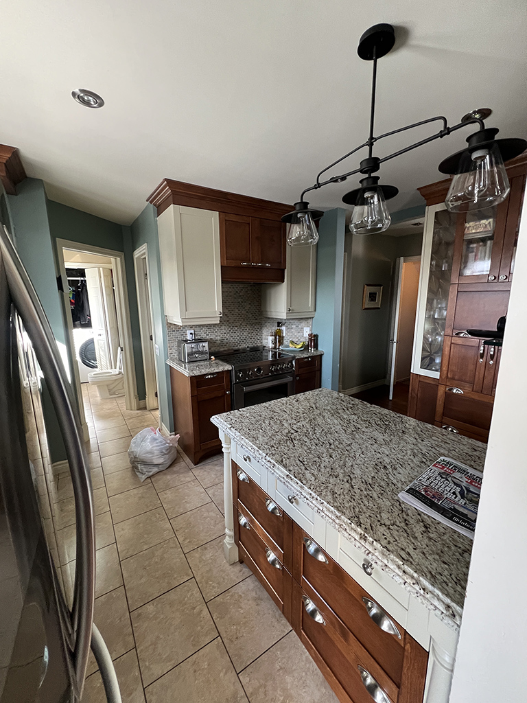 L’ancienne cuisine, petite, foncée et cloisonnée, a cédé sa place à un espace dégagé à aire ouverte de style transitionnel, qui baigne littéralement la maison de lumière grâce aux judicieux choix de matériaux de teintes claires. Les armoires Miralis en similaque, le comptoir Miralis en Dekton, le dosseret en tuiles métro, le plancher chauffant en porcelaine et le plancher en merisier massif fini brossé se marient à merveille avec les touches de bois de frêne (portez attention à la magnifique hotte), créant ainsi une atmosphère à la fois chaleureuse et légère. Autre changement majeur : Atelier Avant-Garde a déplacé et réaménagé la salle d’eau et de lavage afin de créer une arrière-cuisine qui permet de ranger les petits électroménagers.