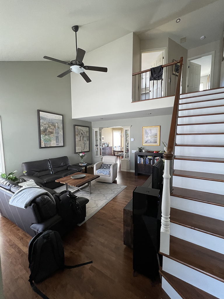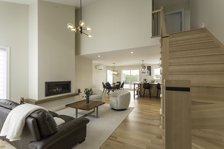 Afin de sublimer ces nouveaux espaces, un foyer au gaz a été intégré au salon. Le plafond cathédrale, désormais pleinement mis en valeur, accentue l’impression de grandeur. On peut donc dire mission accomplie pour cette transformation extrême !