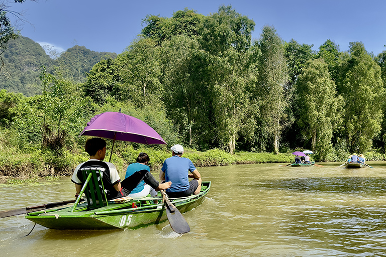 Nous avons aussi visité Ninh Binh, une région surnommée la « baie de Ha Long terrestre » pour ses paysages karstiques époustouflants. Nous avons vécu une expérience aussi paisible qu’insolite : une promenade en sampan glissant au fil de l’eau à travers grottes mystérieuses et pitons rocheux majestueux. Le spectacle était aussi sur l’embarcation, où les rameuses, avec une dextérité étonnante, maniaient les rames… avec leurs pieds ! Un ballet à la fois amusant et fascinant, qui ajoutait une touche d’authenticité à cette escapade au cœur de la nature vietnamienne.