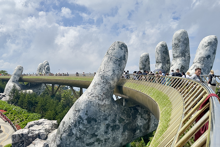 Après un copieux déjeuner, nous montons tous à bord de notre autocar privé en direction d’une attraction iconique : le Golden Bridge. Toy, notre sympathique guide local, raconte l’histoire de ce pont mythique, et Jean-Michel nous livre quelques anecdotes sur Da Nang, une ville qu’il connaît bien pour y avoir habité pendant trois mois en 2019.