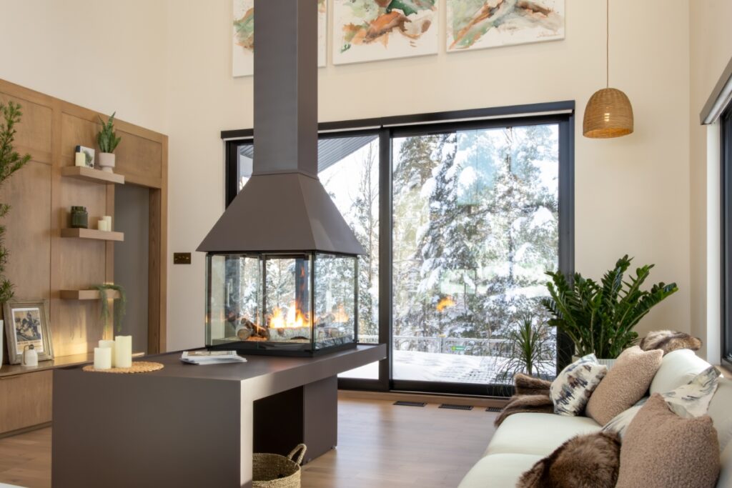 Zoom sur les œuvres d’art — Ce triptyque, que l’on aperçoit au-dessus des grandes portes-fenêtres, a été créé sur mesure par une artiste québécoise représentée par l’agence Noir sur blanc. Sa palette de couleurs évoque la nordicité dans toute sa splendeur. Portez attention : d’autres œuvres de cette même galerie agrémentent les murs de la résidence.