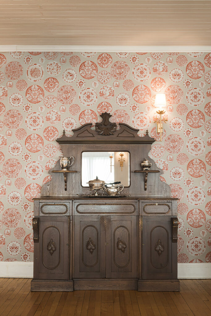 Dans cette vaste salle à manger, le rouge est à l’honneur et permet de dynamiser le mobilier classique en place. On retrouve ainsi cette couleur vibrante dans les rideaux à motifs d’oiseaux ainsi que dans le papier peint et ses motifs s’apparentant à des assiettes de faïence. La magnificence du buffet ancien s’en trouve ainsi décuplée.