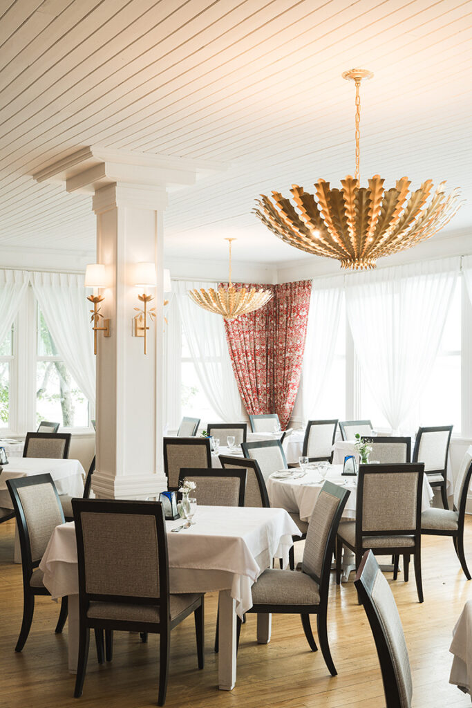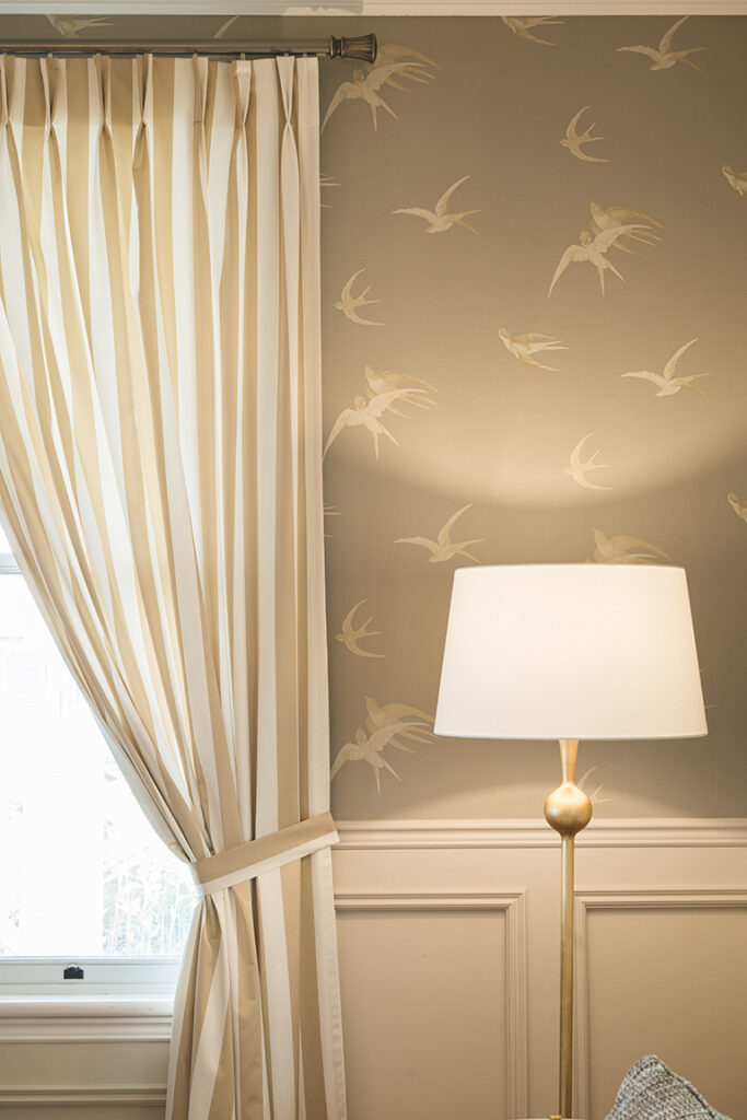 Ce premier salon illustre parfaitement l’approche qu’a empruntée Un Fauteuil Pour Deux afin d’optimiser ce lieu de villégiature qui séduit ses visiteurs par son charme authentique et son panorama exceptionnel sur le fleuve, ses marées et ses couchers de soleil. Comme il était primordial pour les propriétaires de protéger son architecture et son style champêtre, la firme a opté pour une mise en valeur des éléments existants — les plafonds en lattes de bois, les planchers d’origine, les murs en caissons et les rosaces — grâce à une sélection soignée des meubles, des papiers peints, des luminaires et des objets décoratifs, sans oublier la touche finale, l’habillage des fenêtres. Résultat : la sélection du papier peint aux motifs d’hirondelles se marie ici à merveille avec le canapé douillet et ses deux bergères aux tons crème et grège. Le luminaire et la lampe sur pied dorés éclairent délicatement les rideaux à rayures d’une beauté intemporelle.