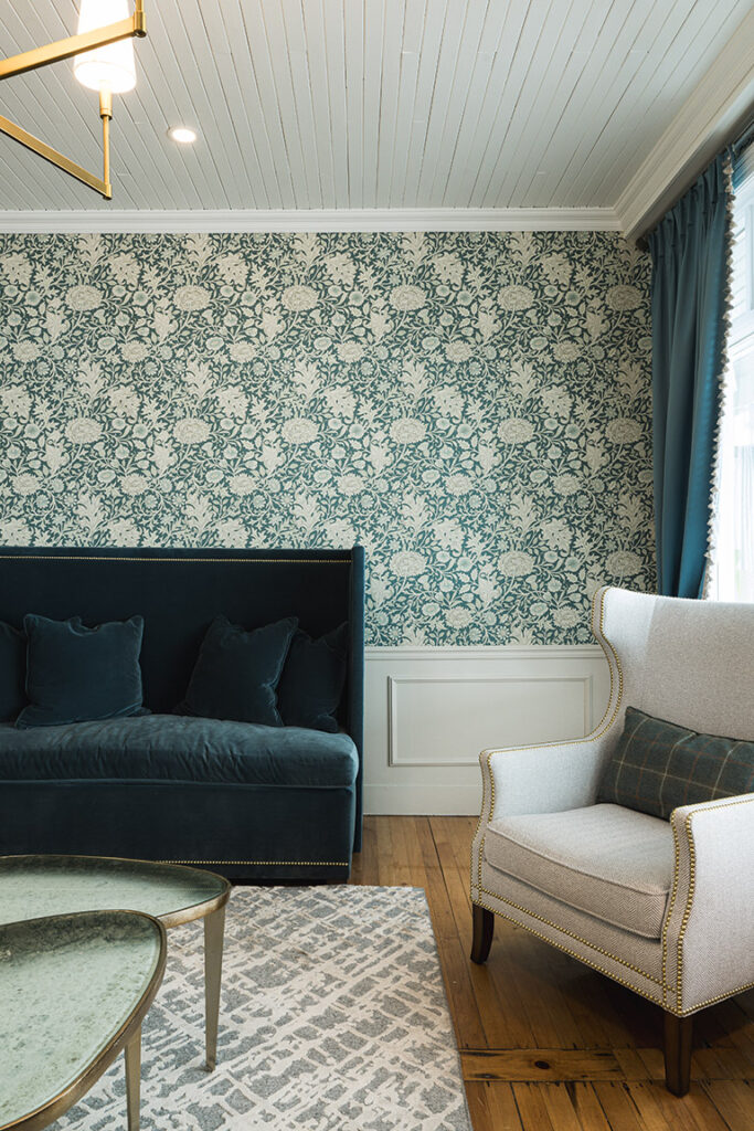 Ce deuxième salon est un alliage parfait entre l’ancien et le nouveau. Les teintes de bleu y règnent, alors que le papier peint floral en relief, avec ses motifs bucoliques, se conjugue avec les rideaux d’un bleu éclatant, une élégante causeuse de style banquette en velours bleu sarcelle ainsi qu’une bergère de couleur crème. Pour une touche de modernité, le tapis en laine tissée apporte du caractère et de la personnalité à l’ensemble.