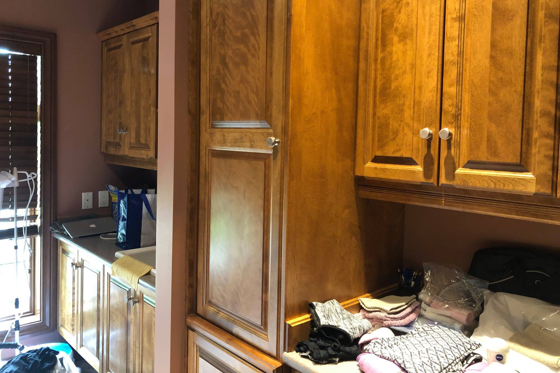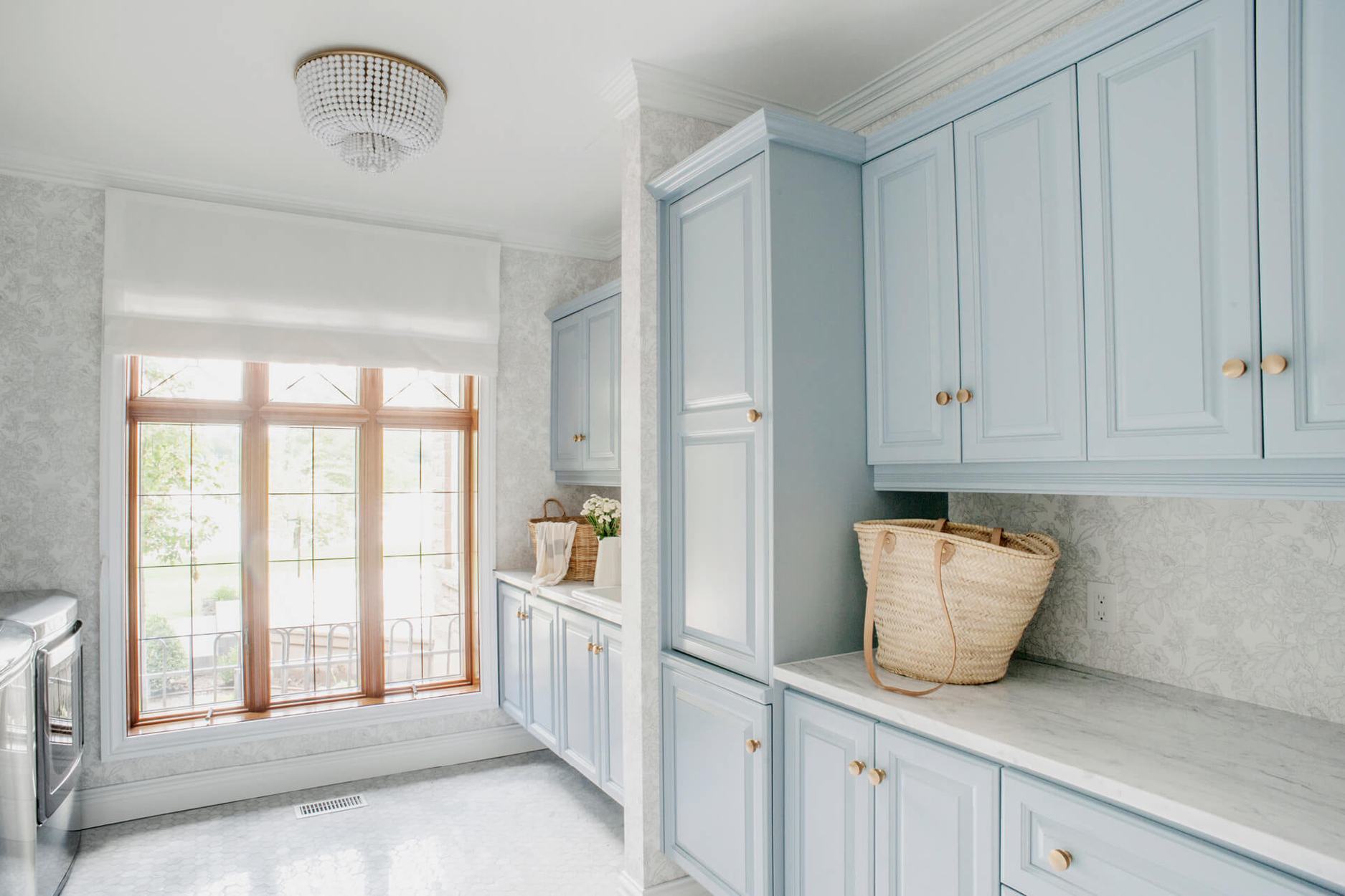APRÈS – Le style campagnard à son meilleur ! Cette salle de lavage donne assurément envie de faire une tonne de brassées. La douceur du papier peint et de la teinte de bleu des armoires jumelées à la quincaillerie dorée en font une pièce absolument sublime ! (Source : AKB Design)