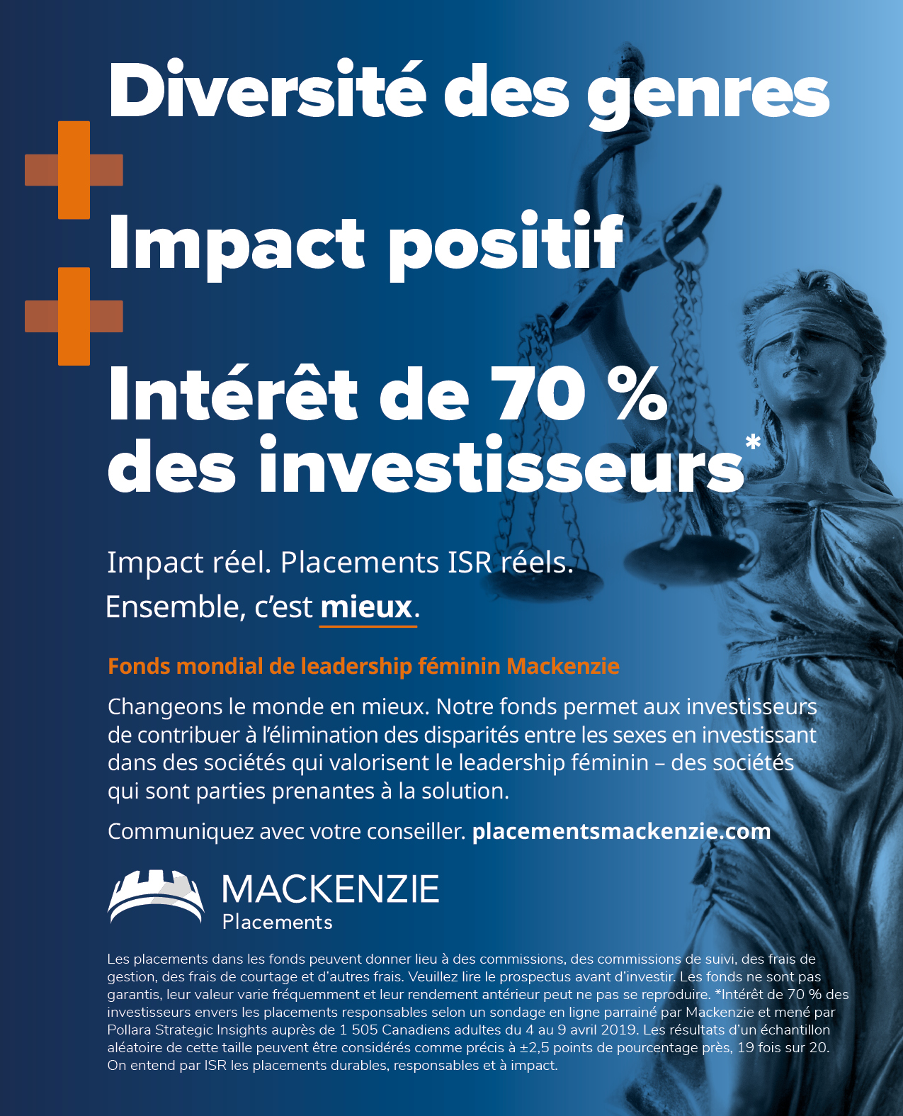 Placements Mackenzie précise que le Fonds inclut de grandes compagnies internationales bien connues. « Il ne s’agit pas véritablement d’une stratégie de niche, mais d’une stratégie de base dans un portefeuille d’actions mondiales, où les sociétés ont reconnu l’importance d’être égalitaires. Nous travaillons actuellement avec les conseillers financiers sur la façon d’intégrer cette solution dans les portefeuilles de leurs investisseurs », conclut Fate Saghir.
