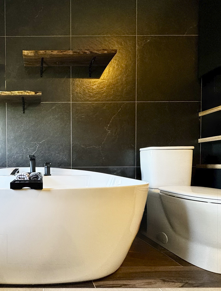 Les nuances sombres dialoguent harmonieusement avec la chaleur du bois et des armoires sur mesure. La robinetterie haut de gamme et les finitions impeccables renforcent le sentiment d’intemporalité, créant une ambiance feutrée où chaque détail compte.
