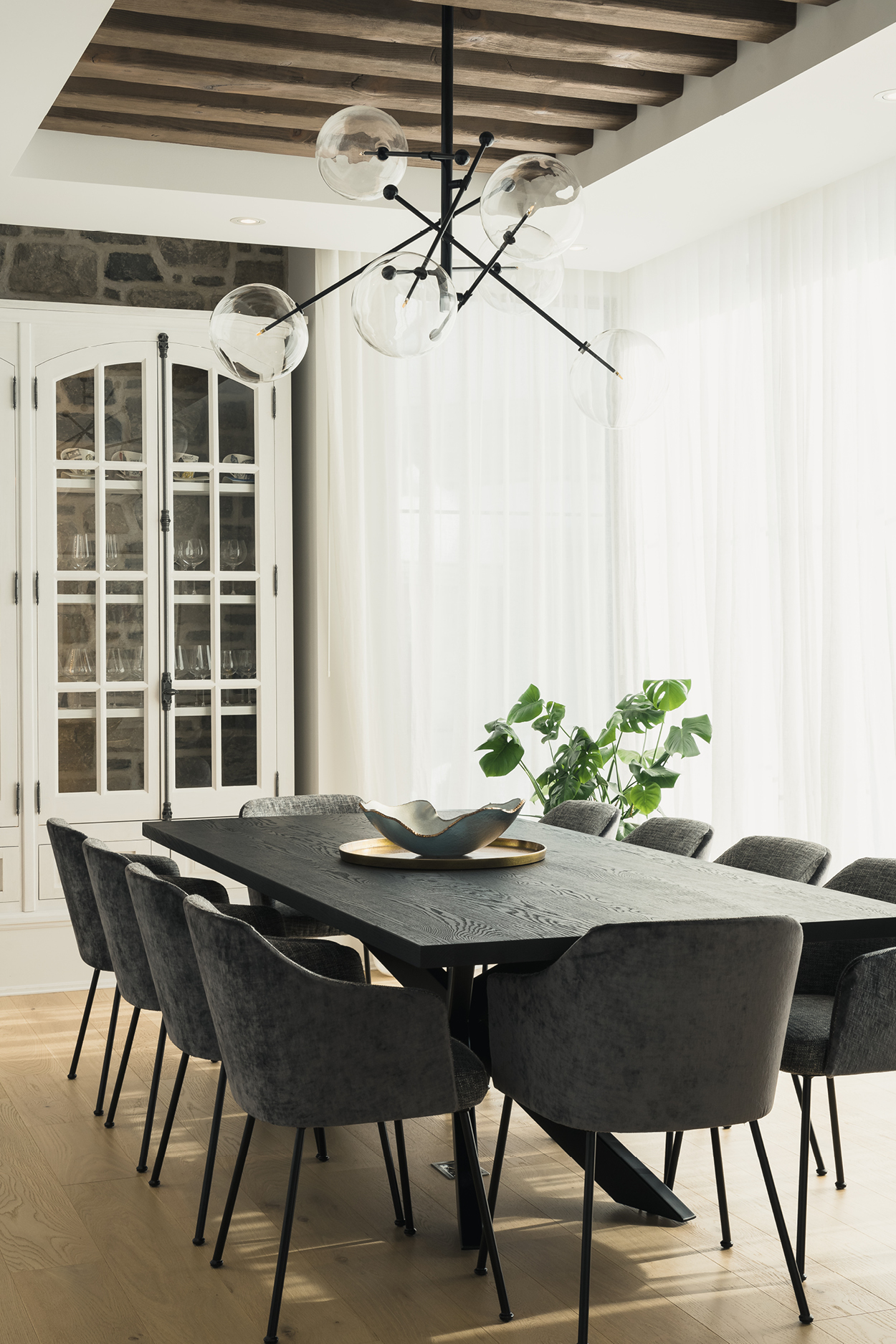 Zoom sur le mobilier sur mesure : un peu partout dans la demeure, mais particulièrement dans la salle à manger, la table et le vaisselier sur mesure fabriqués par Ateliers Jacob témoigne de la minutie et de la passion des artisans qui ont conçu ces pièces uniques spécifiquement pour la propriété.