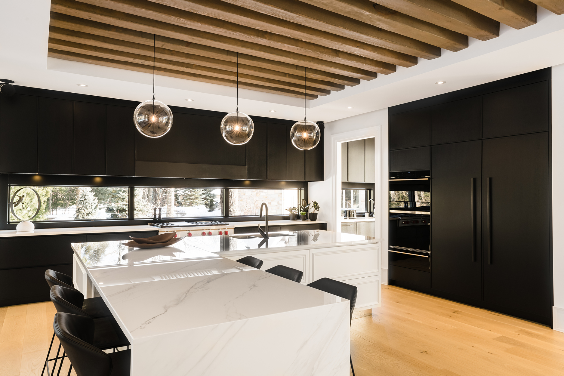 Dans la cuisine, il n’y a pas que les armoires au revêtement noir mat qui retiennent l’attention. Le plafond, avec ses poutres en bois ont également été conçues sur mesure par le travail d’ébénisterie d’Ateliers Jacob. Elles volent littéralement la vedette et apporte de la chaleur à la pièce.