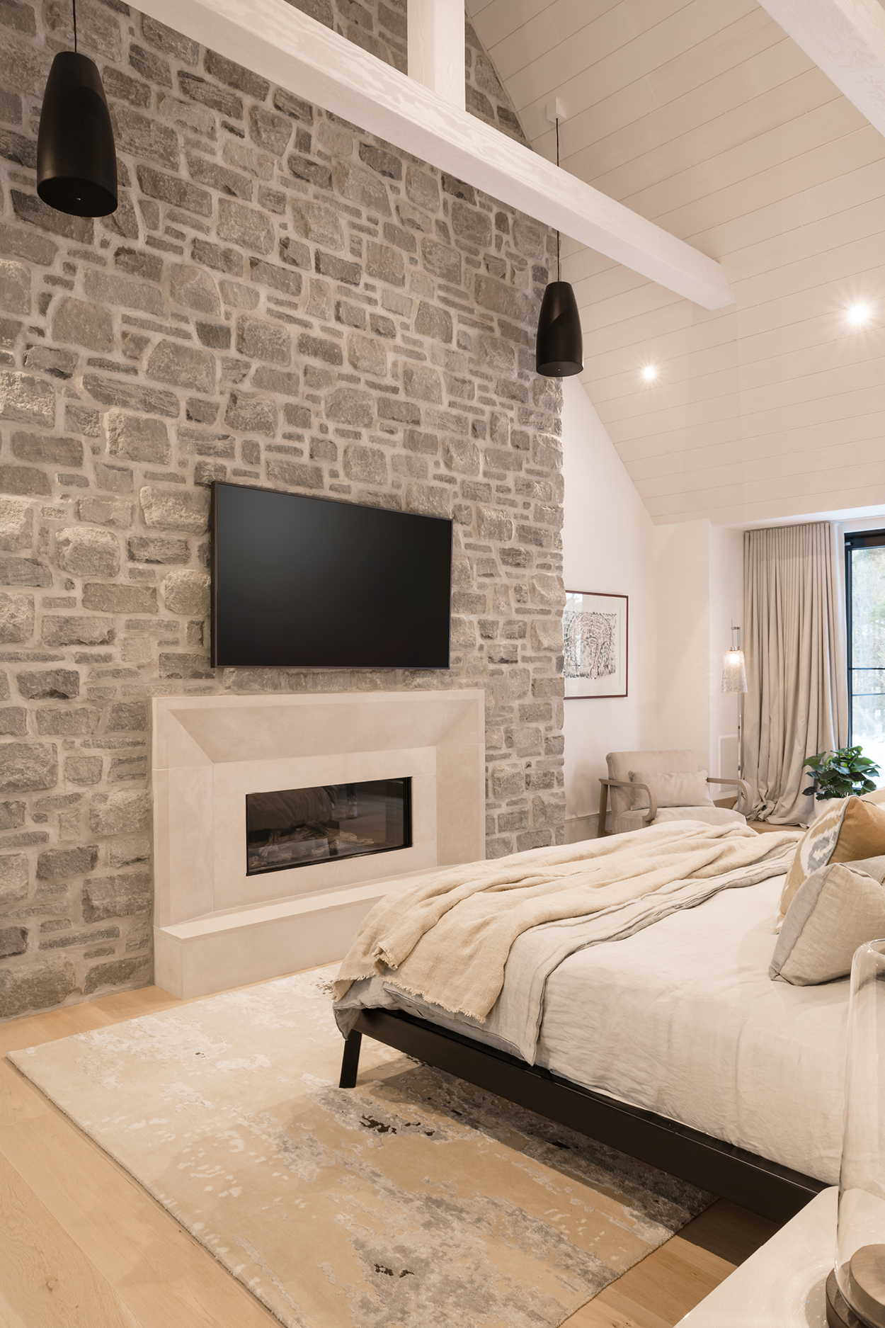 Zoom sur la cheminée : Recouverte de pierre, elle traverse les deux étages de la maison, alors qu’on retrouve un foyer dans le salon et un autre dans la chambre principale. Les lattes et les poutres apparentes apportent une dimension intéressante à la pièce.
